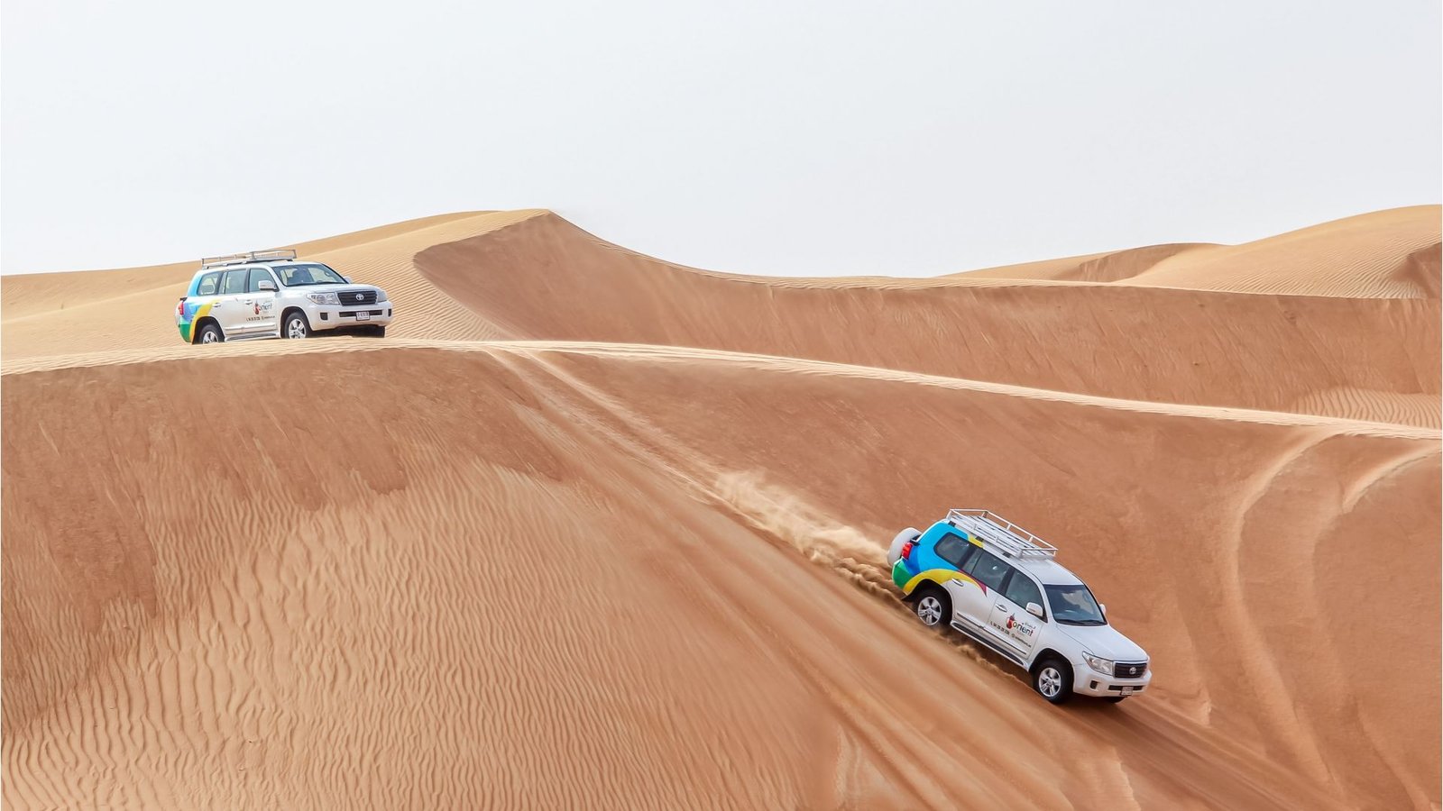 Dune bashing is an off-road adventure in which skilled drivers navigate a desert landscape by driving up, down, and across sand dunes. It involves controlled power slides, sharp turns, and climbs, offering an exhilarating ride while showcasing the unique terrain of the Arabian desert. It’s one of Dubai’s most iconic desert activities.